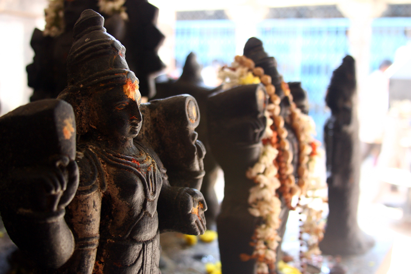 Devotees walk nine times around these nine statues that are placed on a short pillar and arranged into a square grid. The statues of the grahas are placed facing different directions – must be some hidden intelligence in that. In the pic, the statue on the far right corner faces into the grid.
